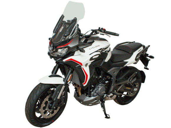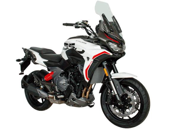 Мотоцикл CYCLONE RA600 – двухместный круизёр, готовый рассекать по городу и скоростным трассам. Лёгкая в управлении и надёжная модель с 550-кубовым двигателем, имеющая комфортный расход топлива для ежедневных поездок, хороший запас хода и оптимальную длину передач для маневрирования в потоке.Мотоцикл оснащён 2-цилиндровым 4-тактным двигателем ZS550SR жидкостного охлаждения с 4 клапанами на каждом цилиндре и 2 распредвалами. Двигатель имеет объём 550 см³ и способен обеспечить мощность в 59 л.с. при 8500 об/мин. Максимальный крутящий момент в 55 Нм достигается при 6500 об/мин. Подачу топлива обеспечивает инжектор BOSCH. Механическая коробка передач имеет 6 ступеней и схему 1-N-2-3-4-5-6.Максимальная скорость 165 км/ч.Объём топливного бака 14,5 литра.Колёса с легосплавными дисками имеют диаметр 16 дюймов. В качестве подвески используются телескопическая вилка и регулируемый маятник с моноамортизатором. Мотоцикл оснащён датчиками давления в шинах, показатели от которых выводятся на приборную панель. Клиренс в 150 мм позволяет комфортно проходить препятствия на дороге.Тормозная система произведена компанией J.JUAN, входящей в холдинг BREMBO. На оба колеса установлены гидравлические дисковые тормоза. Спереди установлен 2-поршневой суппорт, сзади используется однопоршневой суппорт с плавающей скобой. Дополнительную безопасность обеспечивают системы ABS и TCS. Они повышают устойчивость при экстренном торможении и на сложных поверхностях.Габариты модели 2190х855х1115 мм, снаряженная масса 198 кг. Высота по седлу 725 мм, колёсная база 1510 мм. Мотоцикл оснащён USB-портом для зарядки устройств.