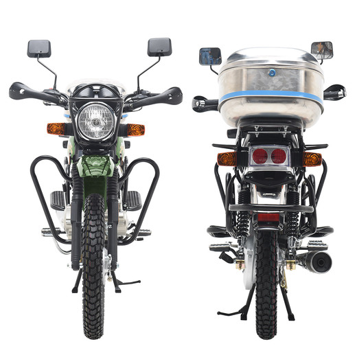 Комплектация Дуги безопасности, проверенные временем барабанные тормоза на переднем и заднем колесах, защитный кожух цепи, широкое и длинное сиденье и интегрированные в раму пассажирские подножки. Цепь 428Н.