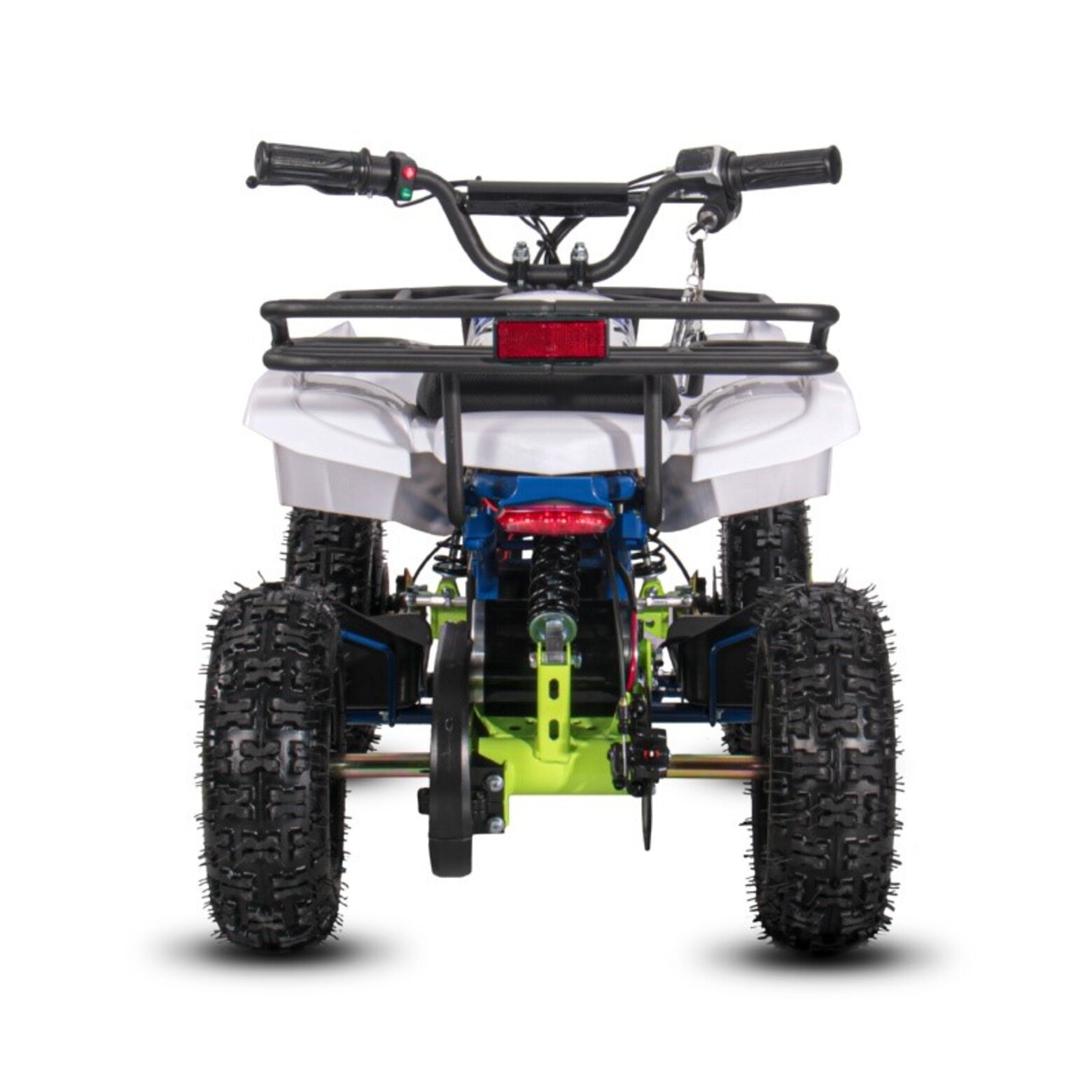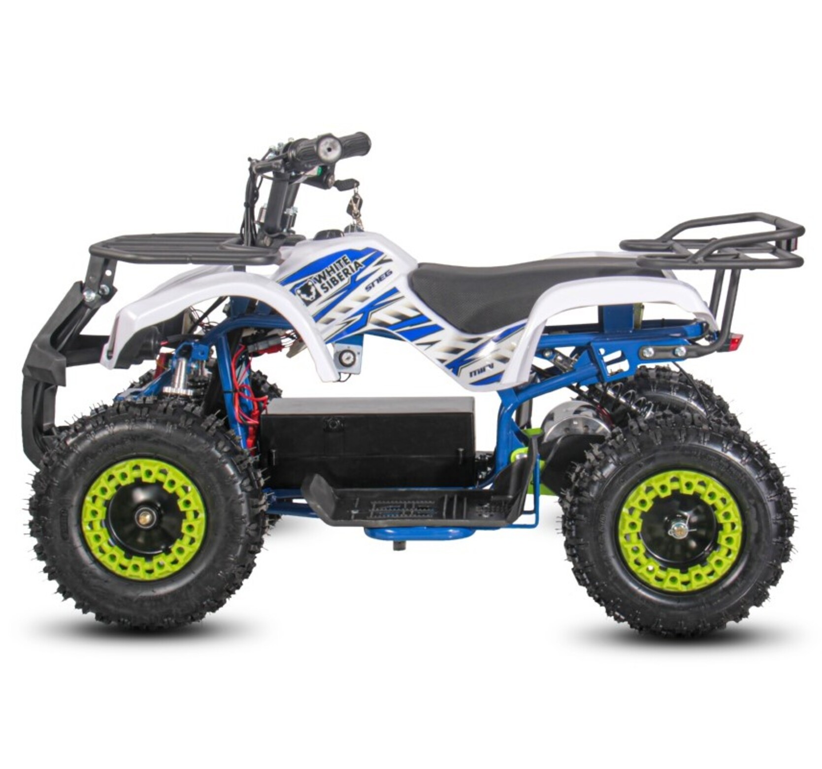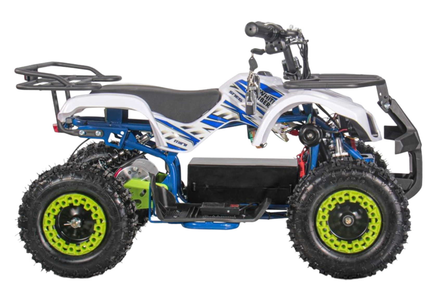 Детский электрический квадроцикл SNEG MINI BLUE 1000WЭлектроквадроцикл SNEG MINI 1000WДанная модель из нашего каталога рассчитана на детей от 3 до 8 лет. Он комфортен, удобен и прост в управлении, благодаря обилию регулировок. Создан для обучения детей управлению мото-техникой в Российских условиях.Что же отличает SNEG MINI 1000W от конкурентов?• Масляные амортизаторы, которые можно настроить в соответствии со своим стилем езды;• Батарея 36V в жестком чехле;• Есть родительский контроль (пульт вкл/выкл радиус действия до 70м (в зависимости от местности));• Дисковые тормоза;• LED оптика;• Классический внешний вид;• Ножной тормоз;• Бесступенчатый ограничитель скорости (1 скорость 5-7 км/ч ; 2 скорость 12-15 км/ч ; 3 скорость 23-25 км/ч)• Шины: пневматические, резиновые, бескамерные (Перед: 4.10-6 Зад: 10х5.00-6)• Рама стальная, трубчатая - окрашена порошковой краской.Детский электрический квадроцикл SNEG MINI BLUE 1000W – лёгкий и послушный аппарат для детей. Сбалансированные характеристики, простота управления, наличие большого количества настроек – позволяют настроить под любого райдера. А главные преимущества – лёгкость обслуживания и возможность прогулок в парках, куда нельзя попасть на бензиновой технике.