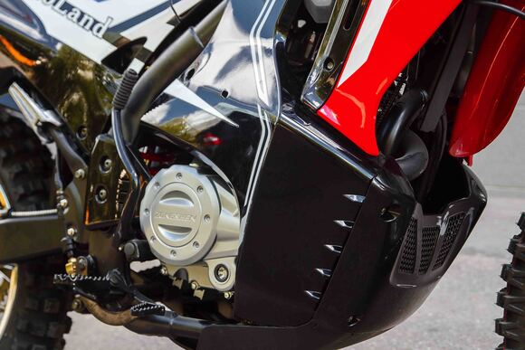 Комплектация Багажник, руль с перемычкой, дисковые гидравлические тормоза, защита цепи, защита двигателя, зеркала, крепление номера.