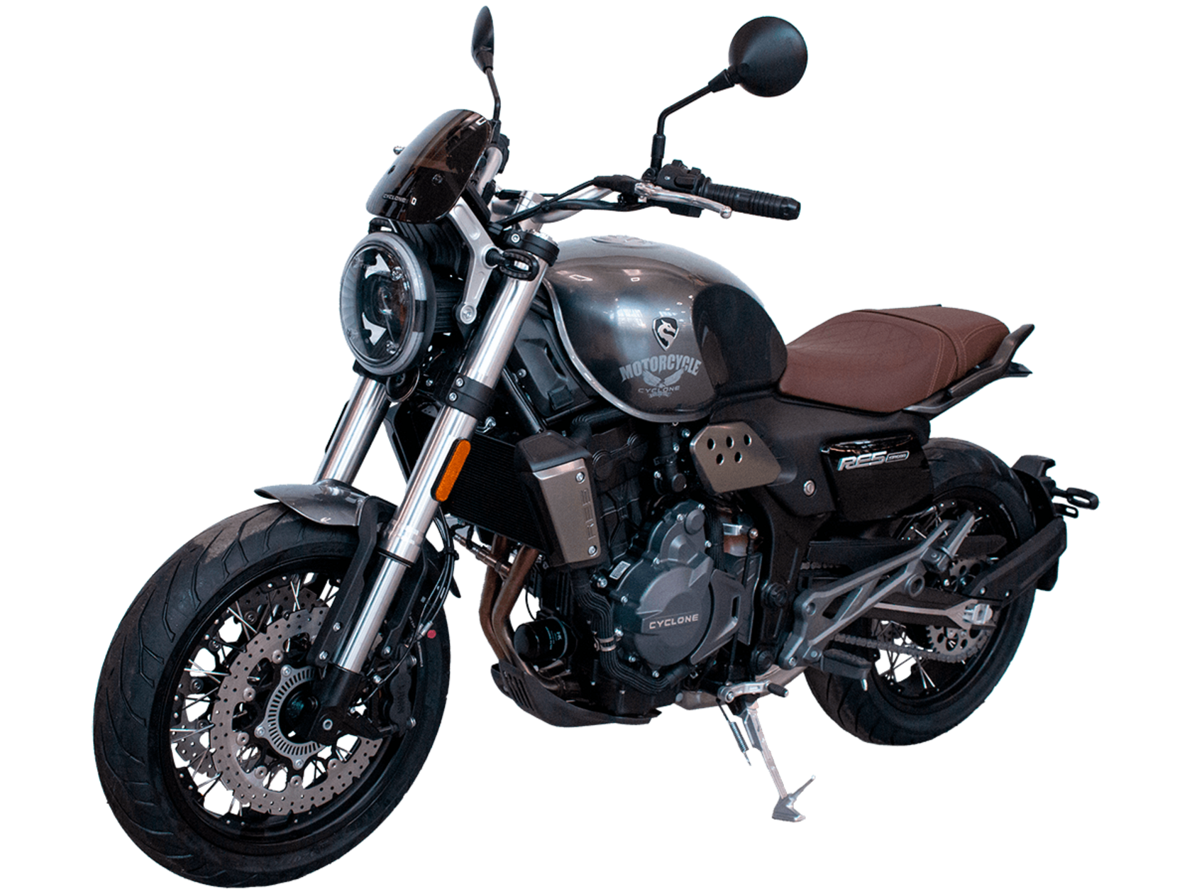 CYCLONE RE5 (SR600) – классик, в котором брутальная простота объединяется с современными технологиями. Данная модель является самой крупнокубатурной среди классических мотоциклов компании CYCLONE.Двухцилиндровый четырёхтактный двигатель объёмом 550 см3 выдаёт 60 л.с. на 8500 об/мин. Максимальный крутящий момент достигается на 6500 об/мин и составляет 55 Н·м. Инжекторный впрыск топлива с блоком управления BOSCH увеличивает топливную экономичность, а также позволяет добиться высокой приёмистости и неприхотливости агрегата. Жидкостная система охлаждения не допустит перегрева двигателя даже при самом агрессивном вождении. На мотоцикл установлена 6-ступенчатая механическая коробка передач.Максимальная скорость мотоцикла составляет 170 км/ч.RE5 оснащён классическими спицевыми колёсами диаметром 17 дюймов. Колёса обуты в бескамерные покрышки от легендарной фирмы PIRELLI. С неровностями дороги эффективно справляются телескопическая вилка перевёрнутого типа спереди и маятник с моноамортизатором сзади. Ход передней подвески составляет 120 мм, задней – 50 мм. Оба компонента подвески являются регулируемыми. Эффективное и безопасное замедление с любых скоростей обеспечивают гидравлические дисковые тормоза с ABS спереди и сзади. Тормозные системы произведены известной испанской фирмой J.JUAN (входящей в легендарный холдинг BREMBO).Клиренс мотоцикла составляет 155 мм. Объём топливного бака – 20 л. Снаряжённая масса – 204 кг.Из дополнительного оборудования можно выделить USB-порт и датчики давления в шинах.Мотоцикл сочетает в себе отличные технические характеристики, комфорт и надёжность, что позволяет вам ощутить настоящую свободу на любой дороге.