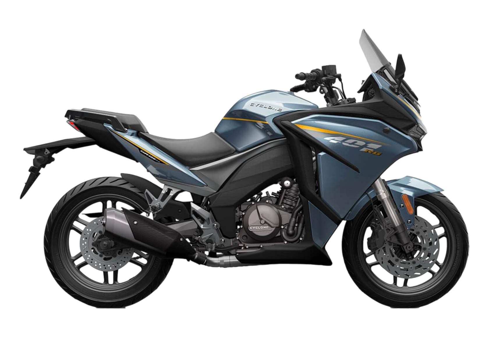 CYCLONE RG401 (SR400GS-B) – турист для покорения самых непростых и протяжённых маршрутов. Он обладает стремительным и современным дизайном в лучших “традициях жанра” туристических мотоциклов.Рядный двухцилиндровый четырёхтактный двигатель объёмом 401 см3 выдаёт 43 л.с. на 9500 об/мин. Максимальный крутящий момент достигается на 8000 об/мин и составляет 37 Н·м. Инжекторный впрыск топлива с блоком управления BOSCH увеличивает топливную экономичность, а также позволяет добиться высокой приёмистости и неприхотливости агрегата. Жидкостная система охлаждения не допустит перегрева двигателя а даже на самых непростых маршрутах. На мотоцикл установлена 6-ступенчатая механическая коробка передач.Максимальная скорость мотоцикла составляет 155 км/ч.RG401 оснащён литыми алюминиевыми дисками диаметром 17 дюймов. Колёса обуты в бескамерные покрышки TIMSUN. С неровностями дороги эффективно справляются телескопическая вилка перевёрнутого типа спереди и маятник с моноамортизатором сзади. Ход передней подвески составляет 120 мм, задней – 55 мм. Оба компонента подвески являются регулируемыми. Эффективное и безопасное замедление с любых скоростей обеспечивают гидравлические дисковые тормоза с двухканальной системой ABS спереди и сзади.Клиренс мотоцикла составляет 155 мм. Объём топливного бака – 21 л. Снаряжённая масса – 213 кг.Модель имеет два видеорегистратора, механическую регулировку ветрового стекла, датчики давления в шинах, подсветку пультов и два USB-порта. При желании можно оснастить мотоцикл двумя боковыми кофрами.Мотоцикл сочетает в себе отличные технические характеристики, комфорт и надёжность, что позволяет вам ощутить настоящую свободу на любой дороге.