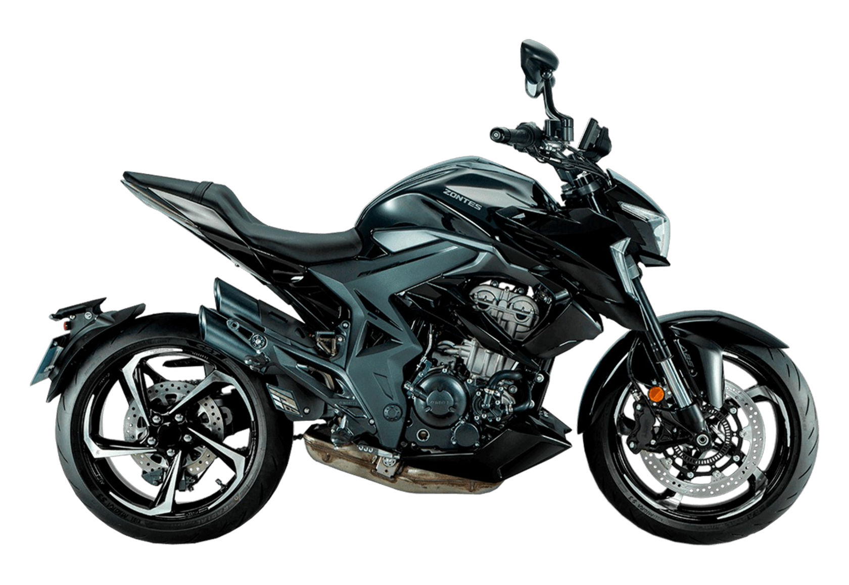 Мотоцикл ZONTES ZT350-R1 – современный нейкед со стремительным и дерзким дизайном. Хорошо подходит как для поездок в городской среде и маневрирования в межрядье.Силовая установка представлена одноцилиндровым 4-тактным двигателем ZT184MP с 4 клапанами и 2 верхними распредвалами. Двигатель имеет объём 348 см³ и обеспечивает мощность в 39 л.с. Оснащён инжектором BOSCH и системой жидкостного охлаждения. Механическая коробка передач имеет 6 ступеней и схему 1-N-2-3-4-5-6. Запуск двигателя осуществляется с помощью бесключевого доступа.Ёмкость топливного бака 15 литров.Колёса представлены литыми алюминиевыми дисками диаметром 17 дюймов. На мотоцикл установлены датчики давления в шинах, показатели от которых выводятся на приборную панель. Для подвески спереди используется телескопическая вилка, сзади – моноамортизатор. Гидравлические дисковые тормоза произведены испанской компанией J.JUAN, входящей в холдинг BREMBO.Для освещения используется яркая LED-оптика, а приборная панель представлена цифровым дисплеем. Рычаги тормоза, сцепления и лапки КПП можно отрегулировать. Имеется 2 USB-порта.Габариты мотоцикла 2030х795х1120 мм. Колёсная база 1390 мм. Высота по седлу 795 мм. Вес 165 кг.
