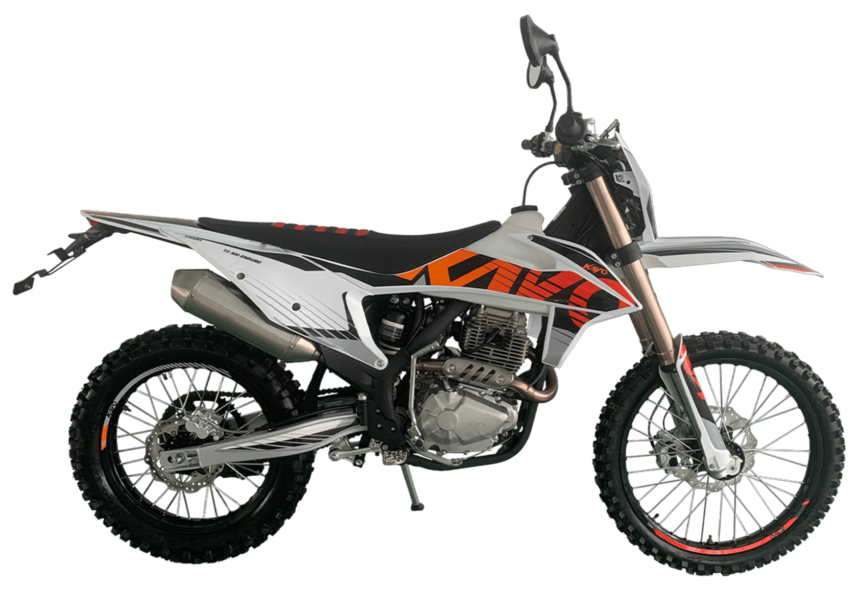 Мотоцикл KAYO T3 300 Enduro 21/18 2025 ПТС – надёжный и производительный эндуро, готовый отправиться по самым сложным маршрутам.Оснащён 4-тактным двигателем объёмом 271,3 см³ с верхним распредвалом и воздушным типом охлаждения. Максимальная мощность в 21,75 л.с. развивает при 8500 об/мин, а максимальный крутящий момент 22 Нм при 6500 об/мин. За подачу топлива отвечает карбюратор PE30. Он обеспечивает топливную экономность и бесперебойную работу двигателя даже в самых жёстких условиях. Соотношение диаметра цилиндра и хода поршня 75,0х61,4. Степень сжатия 9,29:1. Запуск двигателя осуществляется с помощью электростартера или кикстартера. Тип зажигания CDI.Механическая коробка передач имеет 5 ступеней. Привод цепной. Объём топливного бака 8 литров.На мотоцикл установлены спицованные колёса диаметром 21 дюйм спереди и 18 дюймов сзади. Длина подвески спереди 940 мм, длина задней подвески 450 мм. За торможение отвечают дисковые гидравлические тормоза.На мотоцикл установлены спицованные колёса с алюминиевыми ободами, ступицами и стальными буксаторами. Диаметр колёс 21 дюйм спереди и 18 дюймов сзади.За амортизацию отвечает подвеска со стальной прогрессией. Длина передней подвески 940 мм, длина задней подвески 450 мм. Траверсы и задний маятник выполнены из литого алюминия.Мотоцикл имеет ПТС и оснащён всем необходимым для поездок по дорогам общего пользования: диодной светотехникой, звуковым сигналом, цифровой приборной панелью, зеркалами заднего вида. Светотехника представлена яркой фарой для поездок в тёмное время суток, поворотниками, стоп-сигналом. Руль Fatbar выполнен из литого алюминия. Имеются дополнительные подножки для поездок с пассажиром.Габариты мотоцикла 2120х810х1260 мм, вес 119 кг. Клиренс 340 мм, колёсная база 1470 мм, высота по седлу 940 мм.