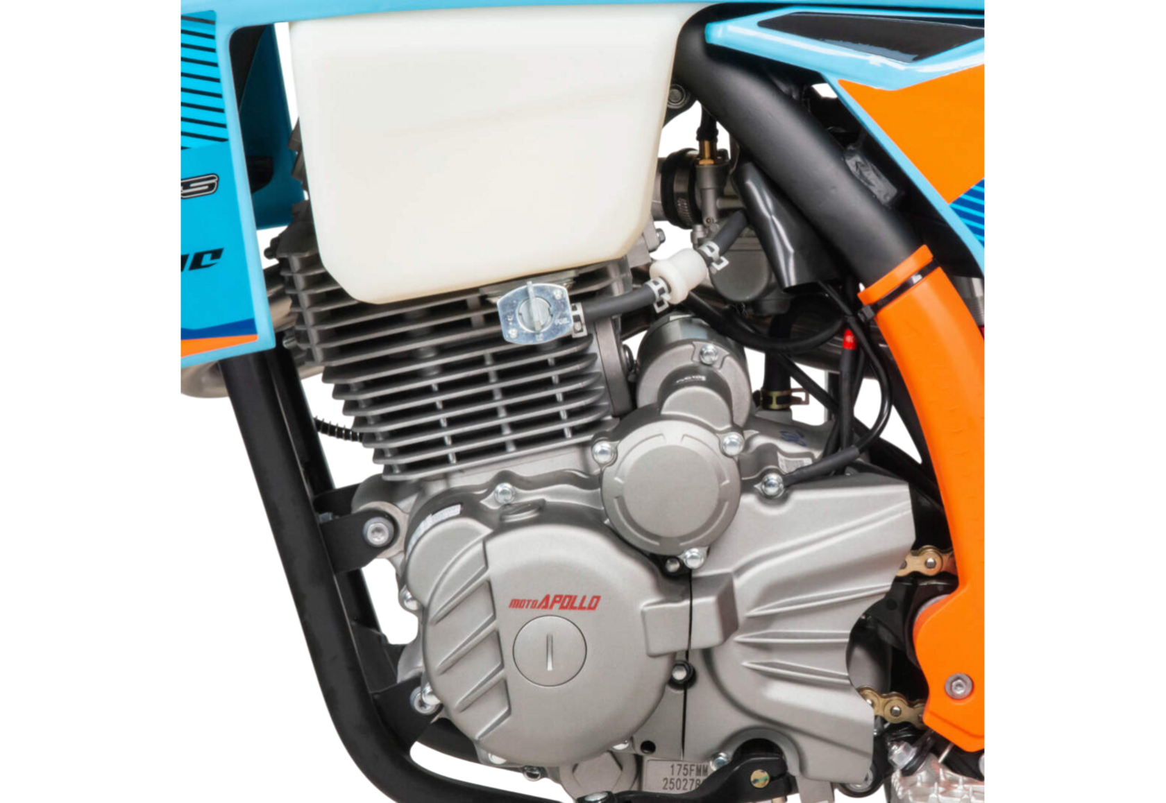 Moto Apollo F3 300 в этой версии — это сбалансированный кроссовый мотоцикл, разработанный для уверенной и динамичной езды по бездорожью. Несмотря на обозначение двигателя 175FMM, его реальный рабочий объём составляет 300 см³, а максимальная мощность — 25 лошадиных сил. Воздушное охлаждение, цепной привод ГРМ и отсутствие балансирного вала обеспечивают классическую кроссовую простоту конструкции, лёгкость обслуживания и высокую ремонтопригодность даже в полевых условиях.