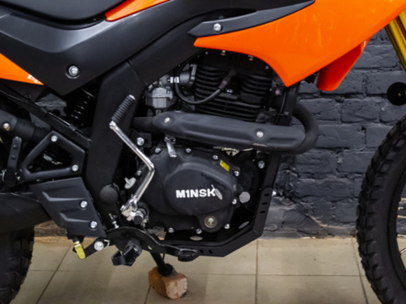 Эндуро мотоцикл Minsk X 250 оснащен двигателем мощностью 16 лошадиных сил и объемом двигателя 225 кубов, топливный бак объемом 10 литров которого хватит более чем на 500 км. Мотоцикл имеет воздушное охлаждение и электростартер, Также установлены дисковые тормоза, разгон до 120 километров в час. Минск Х250 выполнен в традиции бренда, но с учетом современных тенденций и требований. Стоит спортивный глушитель, в базовой комплектации оснащен поворотниками. Для крепежа фар использовались резиновые крепления. Износостойкая резина сохраняет сцепление с любой поверхностью. Данный мотоцикл это выбор тех, кто верен традициям, но всегда готов принять новые технологии, которые вносят в езду множество плюсов. MINSK относится к классу "Эндуро" от своего предшественника он отличается более мощным двигателем объем 225 кубов. Усиленная перевернутая передняя вилка, имеет защиту двигателя и рук, современная диодная оптика и электронный спидометром, наличием USB разъем для зарядки мобильных устройств. В целом мотоцикл Минск X 250 теперь выглядит современно и агрессивно. С этим байком двойного назначения можно быть уверенным в любой ситуации. Глушитель имеет контактный размер и спортивный вид, а помимо своей основной функции, существенно влияет на такие характеристики мотора, как мощность крутящий момент и экономичность. Пластик вокруг фары закрепляется на специальных резиновых креплениях для предотвращения поломок. Наличие поворотников позволяет использовать мотоцикл не только за городом, но и в городских. Высококачественная износостойкая резина с развитым протекторов отлично выдерживает сцепление на поворотах и обеспечивает уверенное торможение на любой дороге.