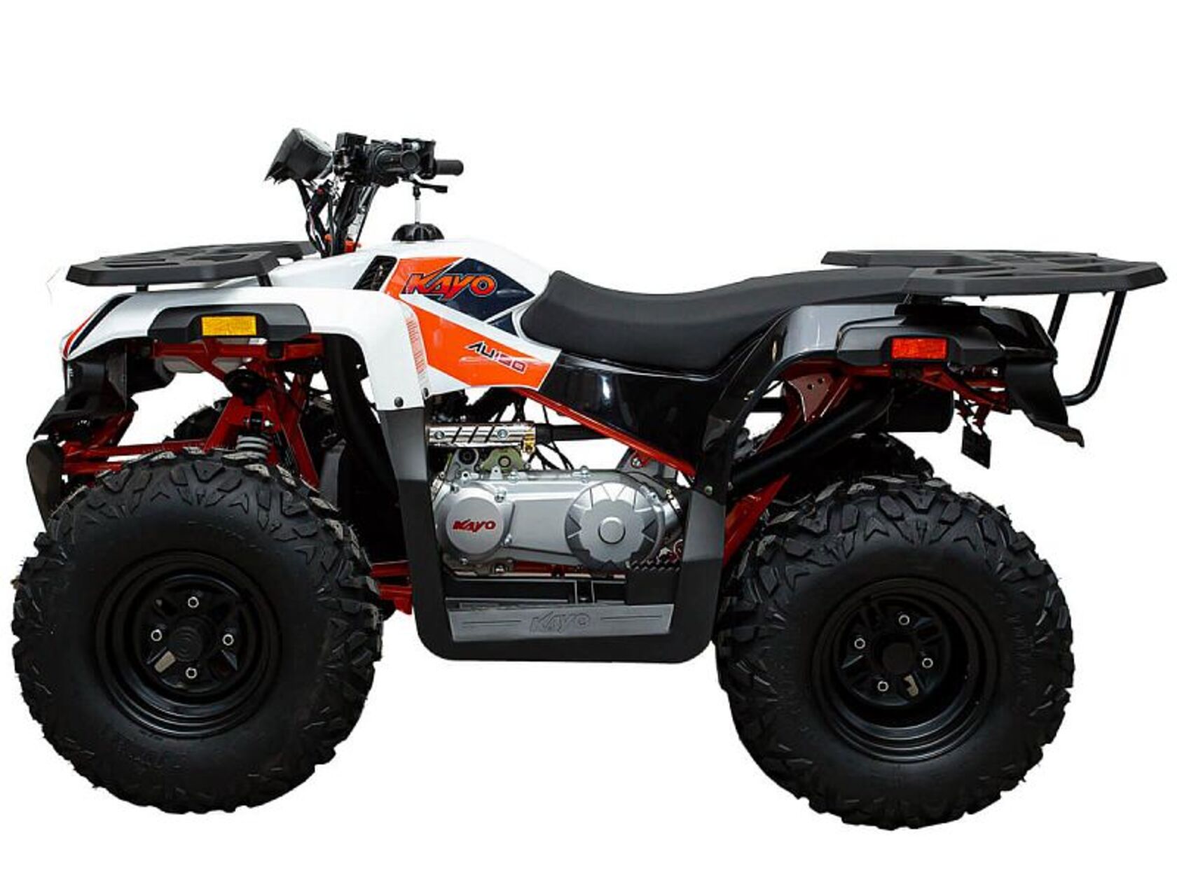 Квадрицикл KAYO AU180 – надёжный и доступный утилитарный квадроцикл с большими возможностями практического применения. Модель пользуется спросом среди широкого круга поклонников мототехники и любителей поездок по бездорожью, поскольку сочетает в себе тяговитый двигатель, энергоёмкую подвеску, отличную эргономику и агрессивный дизайн.Силовая установка представляет собой 4-тактный одноцилиндровый двигатель воздушного охлаждения объёмом 177 см3 (1P63QMK), который позволяет развивать максимальную мощность 10 л.с. Карбюраторная система подачи топлива обеспечивает бесперебойную работу техники в самых жёстких условиях эксплуатации, простоту и лёгкость в обслуживании, а также неприхотливость к качеству топлива. Для надёжной работы силового агрегата и исключения масляного голодания в нижней части картера двигателя установлен производительный масляный насос, что позволит эксплуатировать квадроцикл на склонах до 40˚ без негативных последствий для двигателя.Автоматическая трансмиссия вариаторного типа также снабжена реверсом, который особенно облегчает маневрирование в ограниченных пространствах. Привод на ведущие задние колёса осуществляется цепью. Рама квадрицикла выполнена из хром-молибденового сплава, поэтому она лёгкая, прочная и обеспечивает отличную жёсткость и защиту от повреждений. На квадрицикл установлены литые алюминиевые диски диаметром 10 дюймов, обутые в покрышки с ярко выраженным грунтозацепом (параметры шин: передняя – 10" AT23*7-10" задняя – 10" AT22*10-10").Ходовая часть квадрицикла базируется на передней независимой двухрычажной подвеске с шаровыми опорами и нерегулируемыми амортизаторами, сзади установлена маятниковая подвеска с моноамортизатором, жесткость преднатяга пружины которого можно отрегулировать. Эффективное замедление с любых скоростей обеспечивают гидравлические дисковые тормоза спереди и сзади. Аппарат обладает комплектом качественной светотехники, широкими защитными крыльями, передней и задней багажными площадками для перевозки небольших грузов, фаркопом для прицепа, а также эргономичным сиденьем и удобным рулевым управлением, что обеспечивает комфортную езду.
