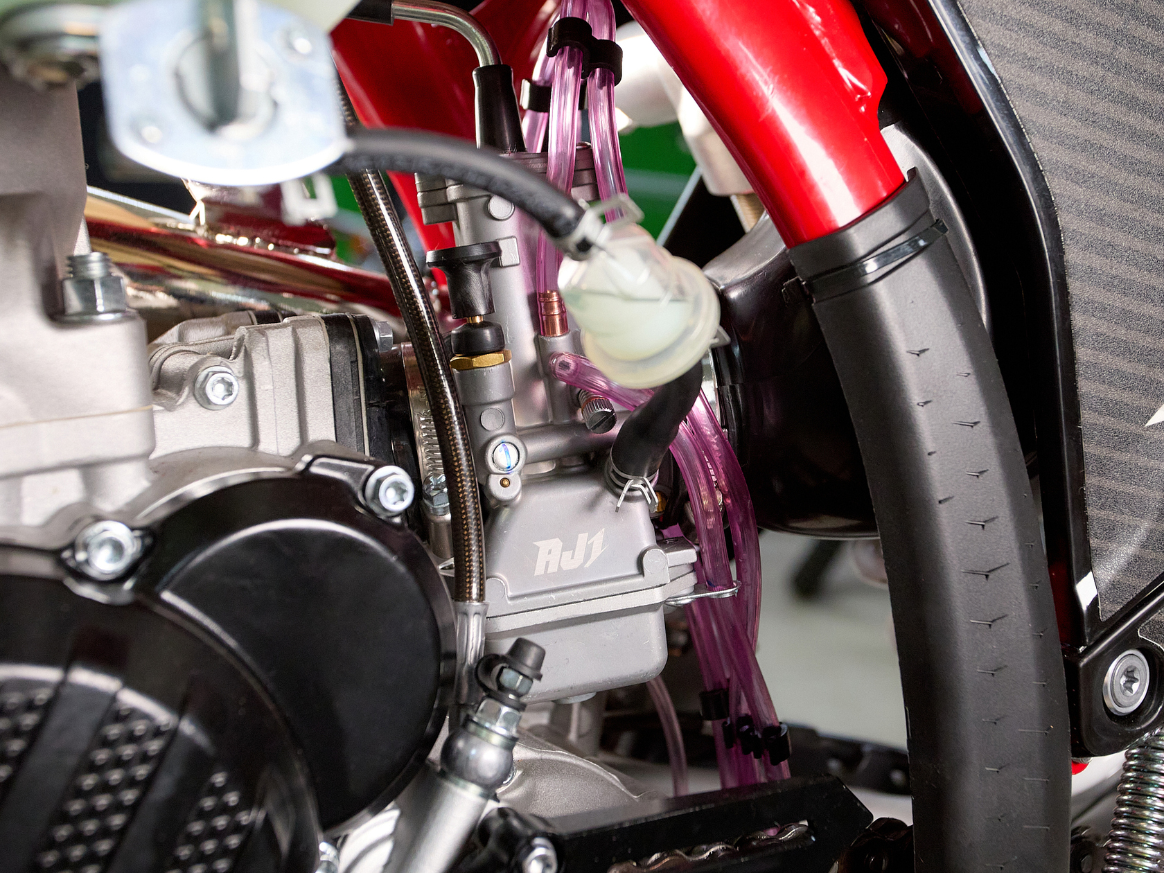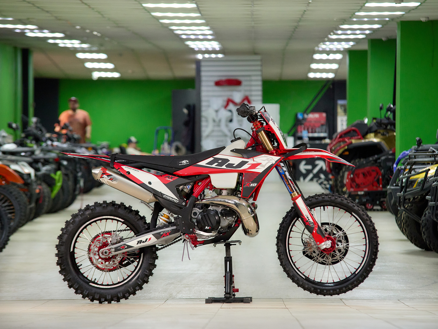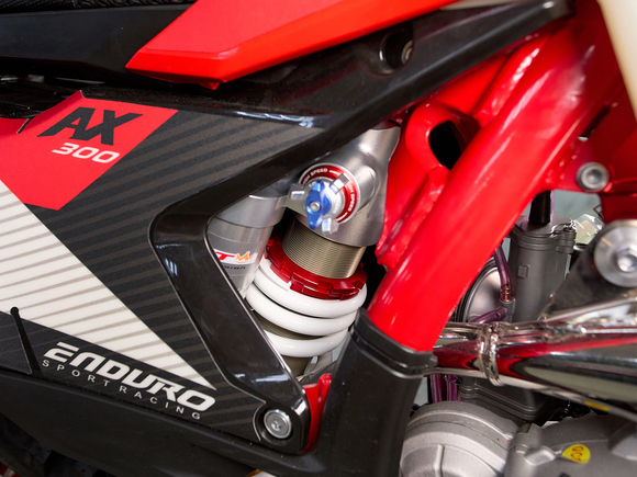 Подробнее о AX300Модифицированная подвеска разработанная AJ1 совместно с HTW, регулировать которую можно теперь без применения инструментов, «на ходу». Двухкамерная передняя вилка с закрытым картриджем (DCC) серии AJ1-T10 с диаметром пера 48 мм и длиной 940 мм, в которой используются двукомпонентные сальники SKF Италия, а также высококачественные направляющие от японской фирмы DID ЯпонияМоноамортизатором HTW T10 регулировка без инструмента с системой PDSНовые фрезерованные траверсы со всеми регулировками а также руль переменного сечением из высокопрочного алюминиевого сплава марки 7075-T6.Новая запатентованная конструкция воздушного фильтра AJ1-Pro Red. Предварительно пропитанный смазкой - фильтр специально создан для обеспечения максимального потока воздуха, сделанный из негорючего материала.Новые радиаторы и дефлекторы воздуха позволили повысить набегающий поток и улучшить охлаждение при движении.Широкие фрезерованные подножки AJ1 из алюминиевого сплава, со сменными шипами из нержавеющей стали.Обода из алюминия 7050-T6 в стандартной комплектации имеют подшипники NSK, 4-мм спицы из нержавеющей стали и алюминиевыми ниппелями в сочетании с новыми шинами AJ1 soft compound обеспечивает постоянное сцепления колес в разных дорожных условиях.Размер колес: перед – 80/100-21 зад – 120/100-18Новый алюминиевый маятник без прогрессии + направлющими с низким коэффициентом трения обеспечивает лучший контроль и экономию веса, необходимую на треке и в горах.Запатентованная тормозная система AJ1 зарекомендовавшая себя, как лучшая в классе, великолепно работающая с тормозными дисками нового дизайн и синтетическими спеченными тормозными колодками Elig Тайвань. Спереди установлен двухпоршневой суппорт AJ1 в сочетании с диском диаметром 260 мм. Сзади – однопоршневой суппорт с диском диметром 220 ммВ стандартную комплектацию входит новая алюминиевая складывающаяся боковая подставку нового дизайна, а также фирменное сиденье AJ1Anti Skid, выполненным из нескользящего материала со специальными прорезиненными вставками.Ведомая звезда AJ1 520 на 52 зубаВыхлопная титановая система AJ1 с Power Bomb и DB-Killer (съёмный) легче на 1 кг предыдущих выхлопных систем от AJ1