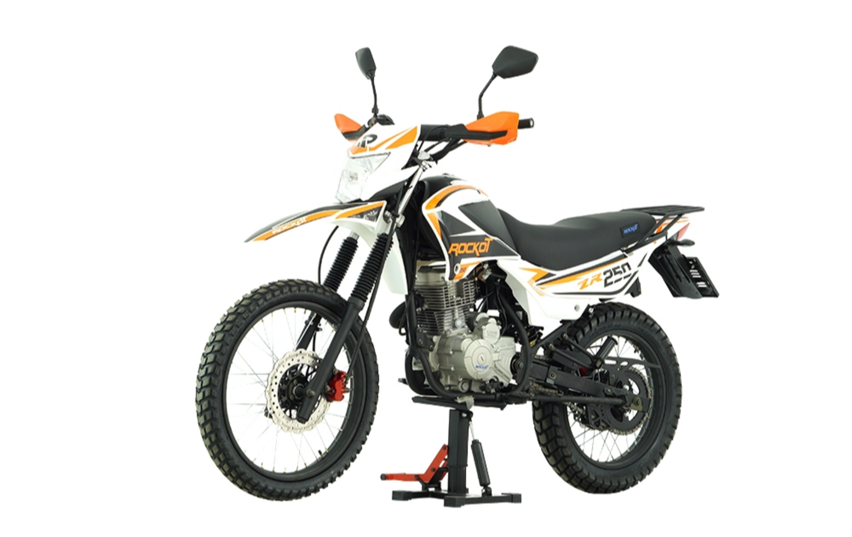 Представляем вашему вниманию новинку сезона 2024 года - бюджетный софт-эндуро мотоцикл ROCKOT ZR250.ZR250 - это полноценный эндуро мотоцикл с электронным ПТС, который был создан для повсеместной езды, будь то асфальтированные дороги общего пользования, грунтовые проселочные дороги и, конечно же, бездорожье. ROCKOT ZR250 выполнен по всем канонам софт-эндуро, а именно: прочный металлический бак, облицовка из мягкого ударопрочного пластика, широкое и комфортное сиденье для водителя и пассажира, а в задней части установлен стальной багажник. Мотоцикл производится в двух вариантах расцветки графики: черно-красной и черно-оранжевой.Дизайн мотоцикла ROCKOT ZR250 напоминает классический эндуро мотоцикл японского производства начала 2000-х годов. Именно эти байки послужили прообразом для создания бюджетного лайт-эндуро мотоцикла. Классическая вилка спереди, безлинковая подвеска сзади и колесная компоновка 21/18 - все это делает мотоцикл стильным, аутентичным, проходимым и доступным. ROCKOT ZR250 оснащен четырехтактным двигателем объемом 223 см³ и мощностью 16 лошадиных сил. Отличительная особенность этого двигателя от других “одноклассников” - это нижний распредвал и привод ГРМ штангами-толкателями. Данная конструкция двигателя является очень простой и надежной.Также, большим преимуществом газораспределительного механизма с приводом на толкателях, считается широкий диапазон крутящего момента во всех диапазонах вращения коленчатого вала.Система питания двигателя - карбюраторная, с высокопроизводительным карбюратором PZ30 с ускорительным насосом, который обеспечивает быстрый отклик на ручку газа, а также стабильную работу даже при холодном запуске. Обогатитель топливной смеси расположен на руле, что делает очень удобным первый запуск.Двигатель оснащен балансирным валом, снижающим уровень вибрации. Мотоцикл построен на прочной стальной раме, окрашенной в черный матовый цвет. Мотоцикл оборудован подножками для перевозки пассажира. Подрамник также выполнен из стали, к которому крепится металлический багажник, позволяющий перевозить грузы и установить центральный кофр. Подвеска ROCKOT ZR250 типична для данного класса мотоциклов - софт-эндуро. Это классическая вилка спереди, длиной 840 мм, и моноамортизатор, длиной 300 мм, сзади. Система рычагов прогрессии отсутствует, что облегчает эксплуатацию и обслуживание подвески мотоцикла. Несмотря на классическую простоту амортизаторов, они позволят комфортно ездить по бездорожью даже с пассажиром. Спереди и сзади установлена дисковая гидравлическая тормозная система. Передний тормозной диск увеличенного диаметра - 270 мм, который работает в паре с двухпоршневым суппортом. Задняя тормозная система имеет диск диаметром 240 мм и однопоршневой суппорт. Гидролиния тормозной системы состоит из армированных шлангов, которые обеспечивают наилучший отклик тормозной системы и повышенную надёжность всей системы. ROCKOT ZR250 с завода комплектуется универсальными туристическим шинами, позволяющими передвигаться по любому типу поверхностей. Передняя шина имеет размерность 90/90-21, а задняя - 120/90-18. Шины установлены на прочные стальные диски, окрашенные в черный матовый цвет.Привод на заднее колесо осуществляется цепью с шагом 520. Ведомая приводная звезда из стали насчитывает 45 зубьев. Кому подойдет эндуро мотоцикл ROCKOT ZR250Колесна